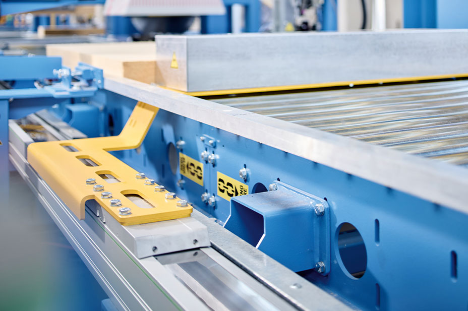 Particularly worthy of mention is the HIWIN HD double axis installed in the I-system. It serves as a transfer unit consisting of two toothed belt axes from the HM-B series and a gigantic synchronising shaft. Over a stroke of 7 meters, the double axis transports the raw panels into the processing line at 15-second intervals. The ready-to-install system impresses with an extra-long slide and high moment load capacities in the axial direction.