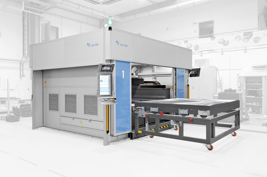 De grootste uitdaging: de twee processen combineren in één machine en in een werkgebied van twee bij twee meter. De oplossing: een gecombineerde laserlas- en snijmachine in portaaluitvoering met palletwisselsysteem. Kettingaandrijvingen met nokken en cantilevers zorgen voor de afwisselende beweging van de pallettafels van buitenaf in de machine en weer terug.